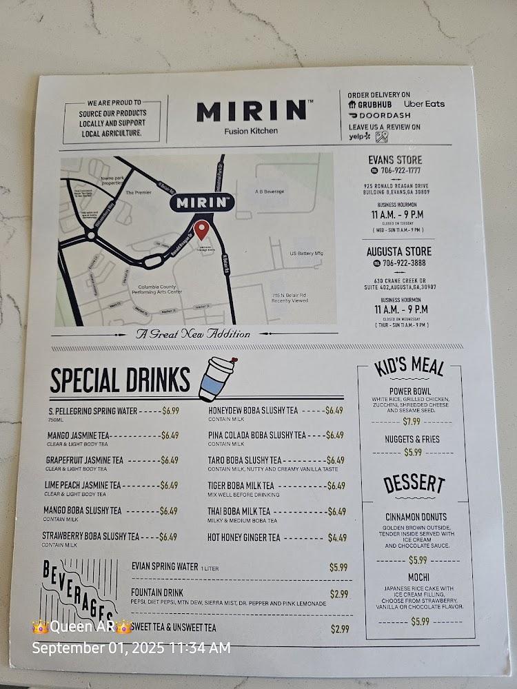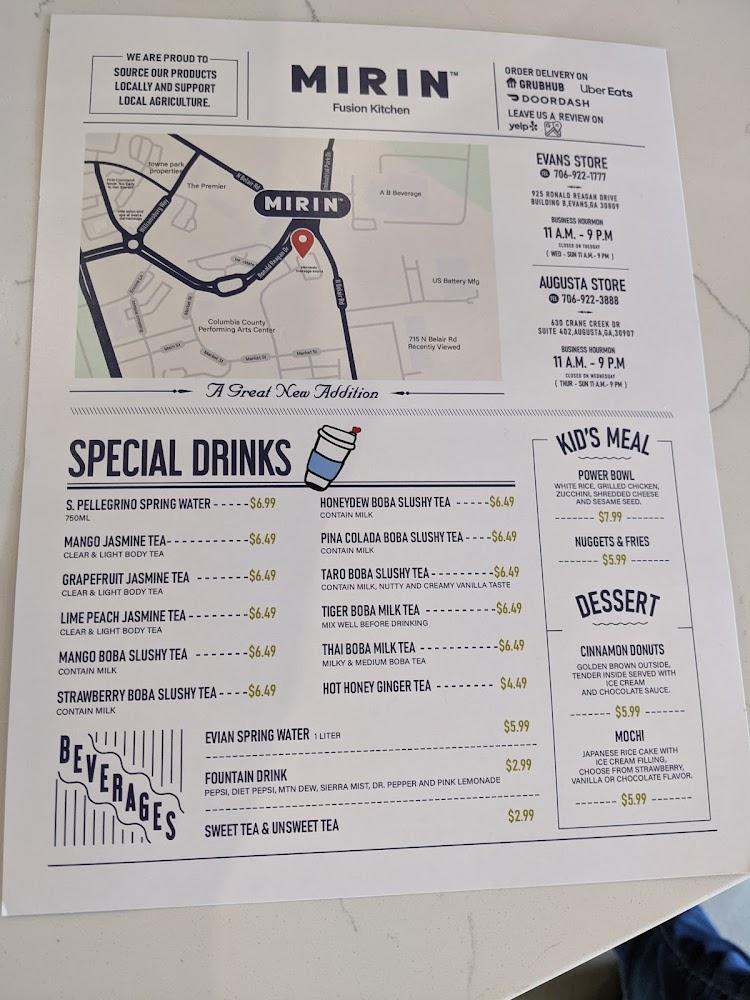 Discover the vibrant flavors of Mirin Fusion Kitchen in Evans, where Asian fusion cuisine meets a cozy dining atmosphere. Located at 935 Ronald Reagan Dr, this restaurant offers a diverse menu with healthy options and specialties that cater to all tastes, including vegetarian delights. Enjoy a quick lunch, a leisurely dinner, or a casual solo meal in our relaxed, stylish setting, complete with outdoor seating. With amenities like wheelchair accessibility, delivery services, and a selection of fine teas and wines, Mirin is perfect for families, groups, and tourists alike. Reservations are welcome, so come savor the delicious dishes with us!