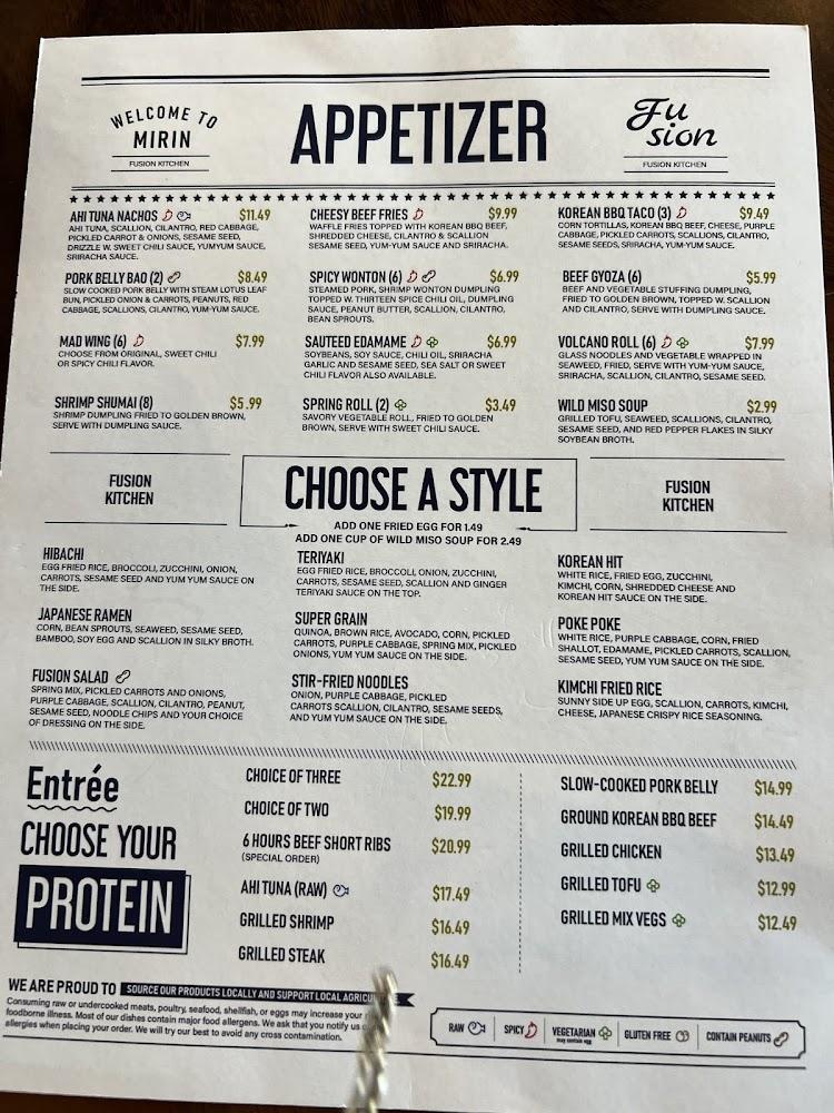 Mirin Fusion Kitchen's menu showcases a variety of fusion and traditional Asian dishes, including fusion salads, teriyaki plates, and kimchi fried rice. For those who enjoy customization, a build-your-own bowl option is available. The kid’s menu offers delightful choices like chicken nuggets and Power Bowls. Be sure to sample the starter selection, including spring rolls and Korean BBQ tacos. The drink menu includes various specialty teas and bubbly beverages, perfect to sip while dining.